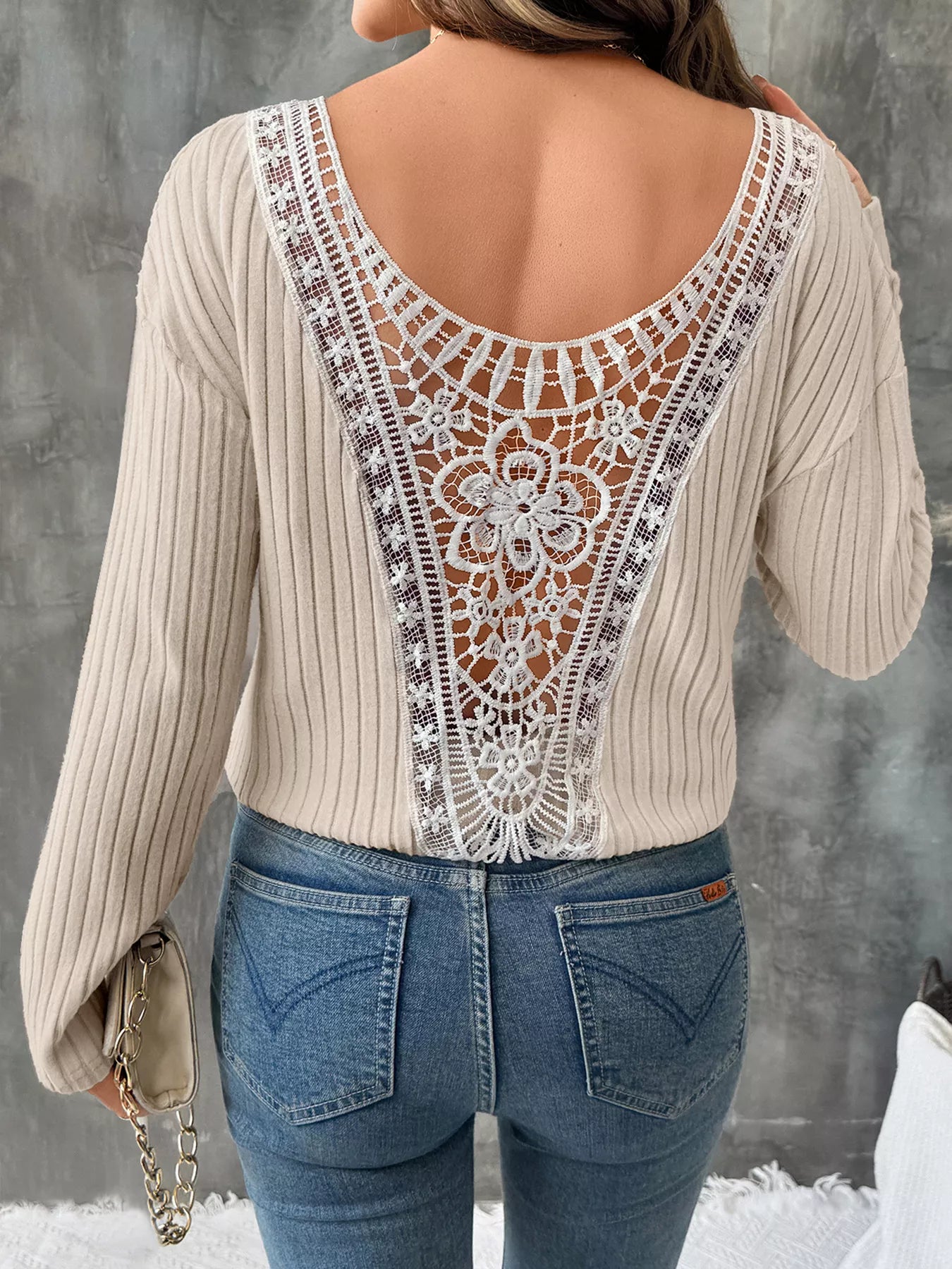Lace Detail Ribbed Knit Long Sleeve T-Shirt