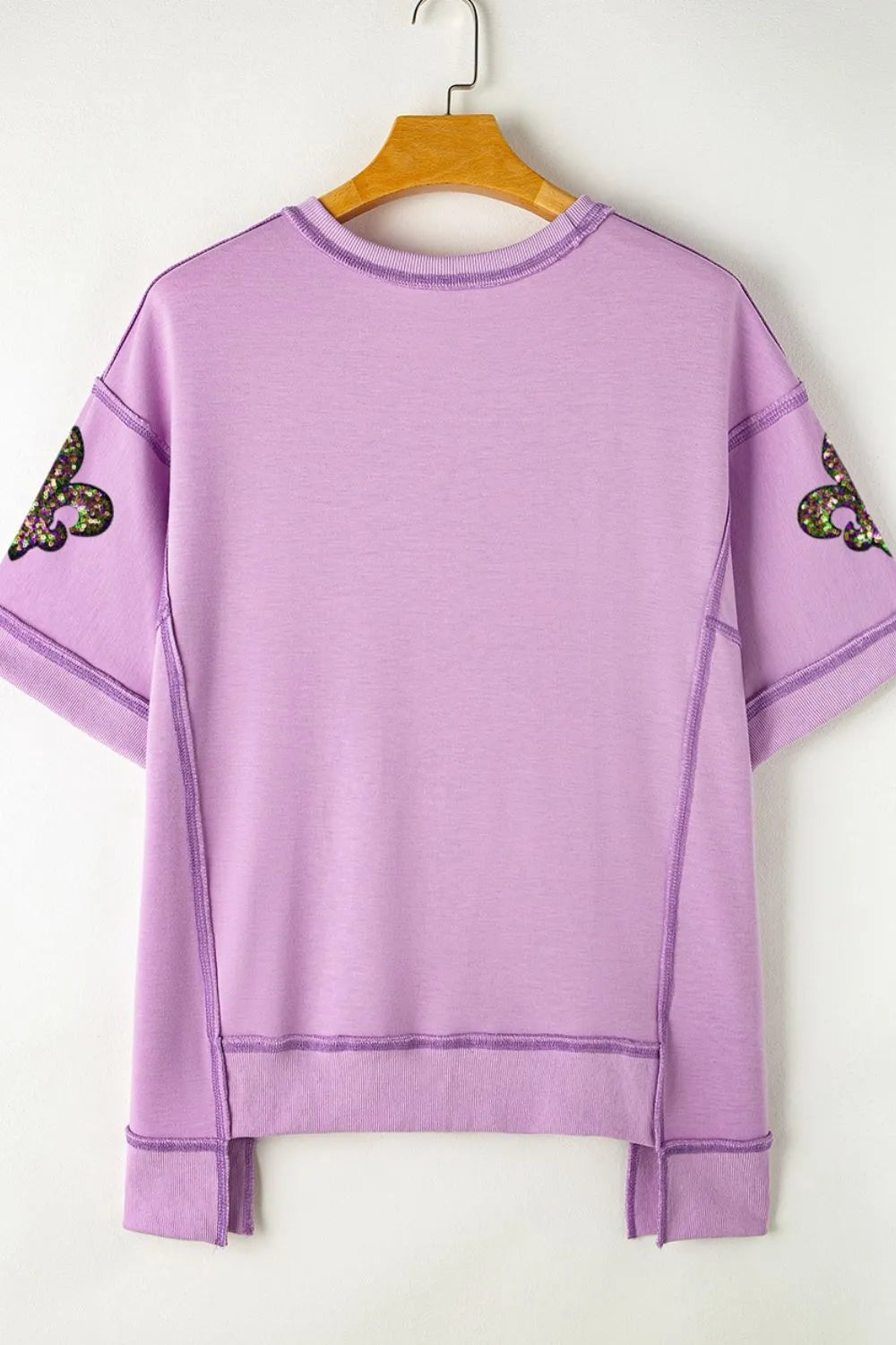 Mardi Gras Sequin Fleur De Lis Patched Exposed Seam Oversize Top