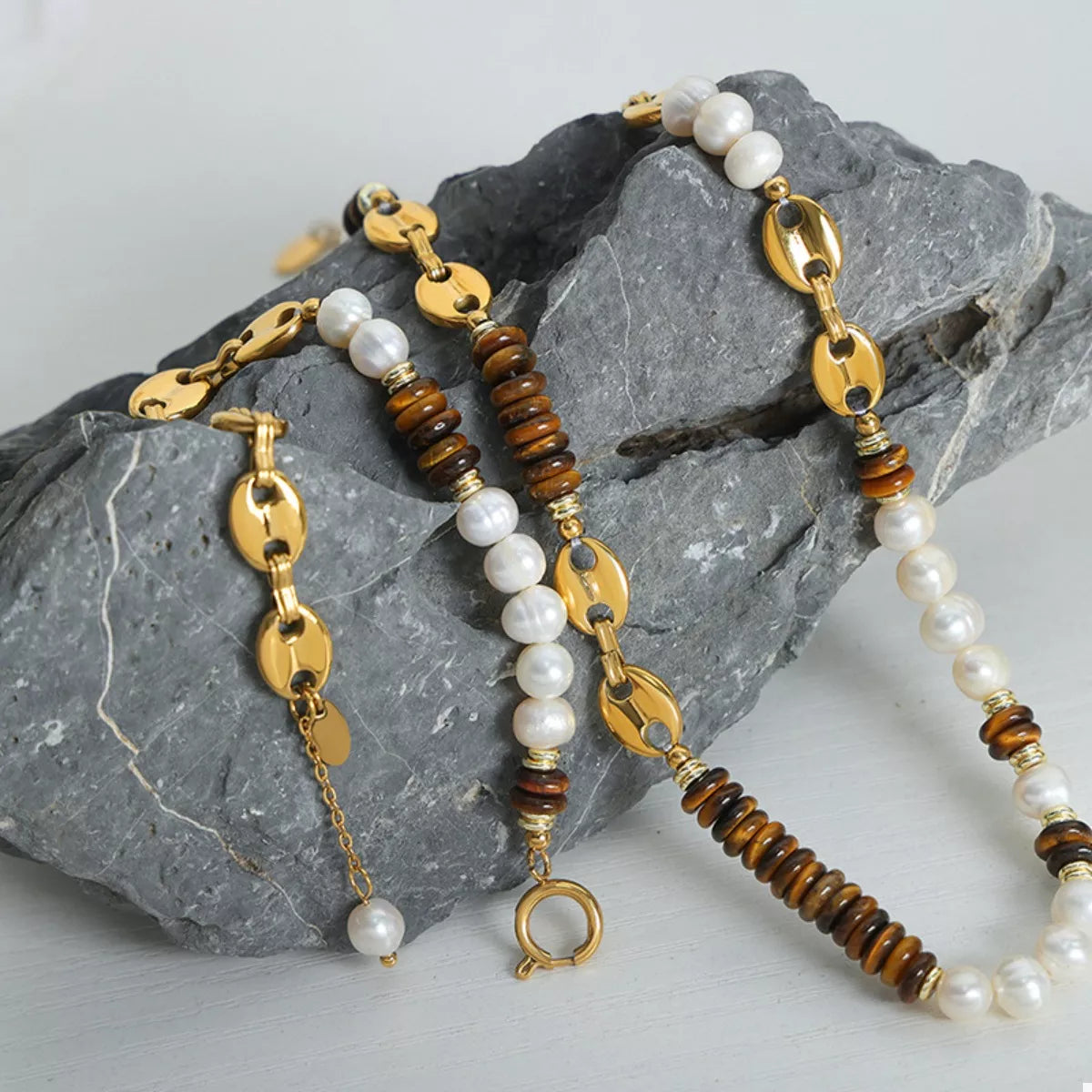 - Material:Tiger's Eye,Freshwater Pearl,18K Gold-Plated,Titanium Steel